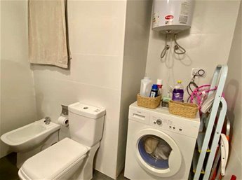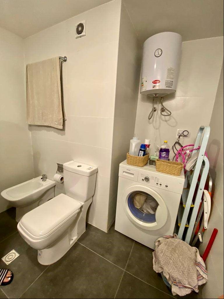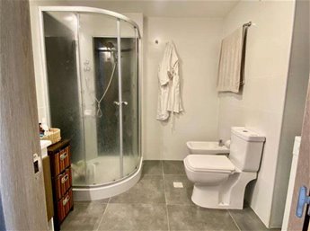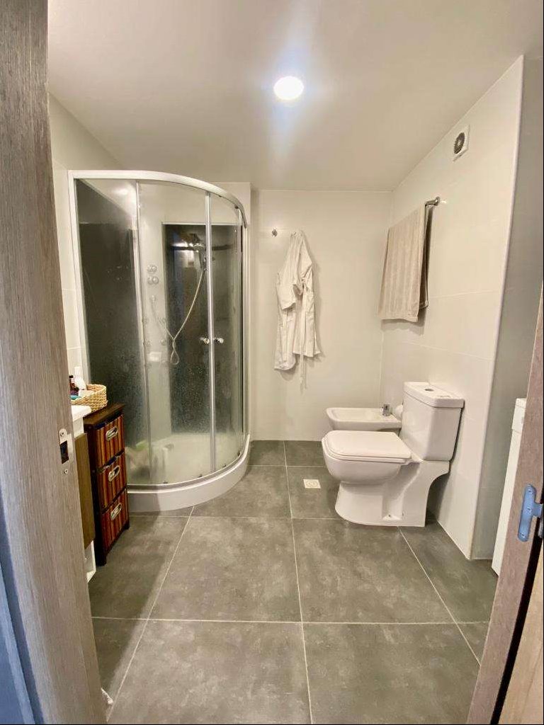 Baño amplio con mampara y sector para maquina de lavar ropa.