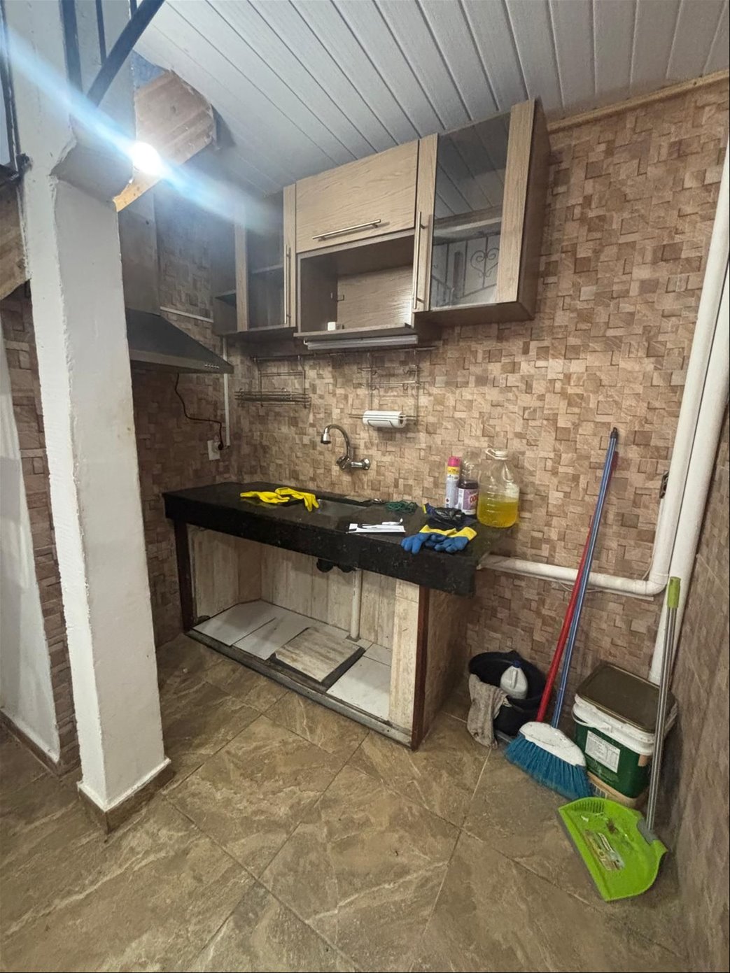 Cocina definida con mesada y campana de extracción.